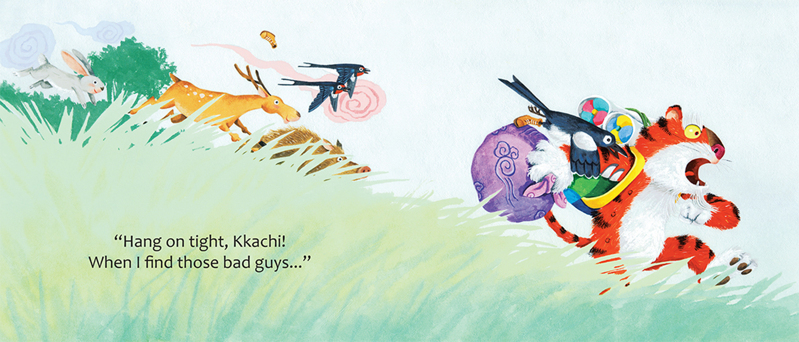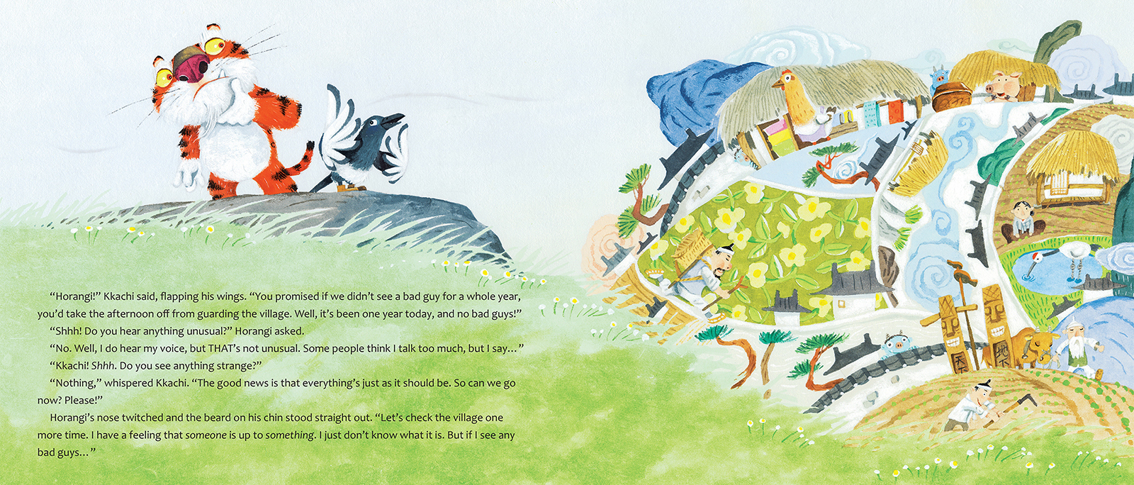Does Horangi, the Korean tiger and proud protector of the village, dare take an afternoon off? He lets his friend Kkachi, the magpie, talk him into it, but he just can’t shake the feeling that something isn’t right. Could there be bad guys around? If there are, Horangi will bite them... ‘cause that’s what tigers do!