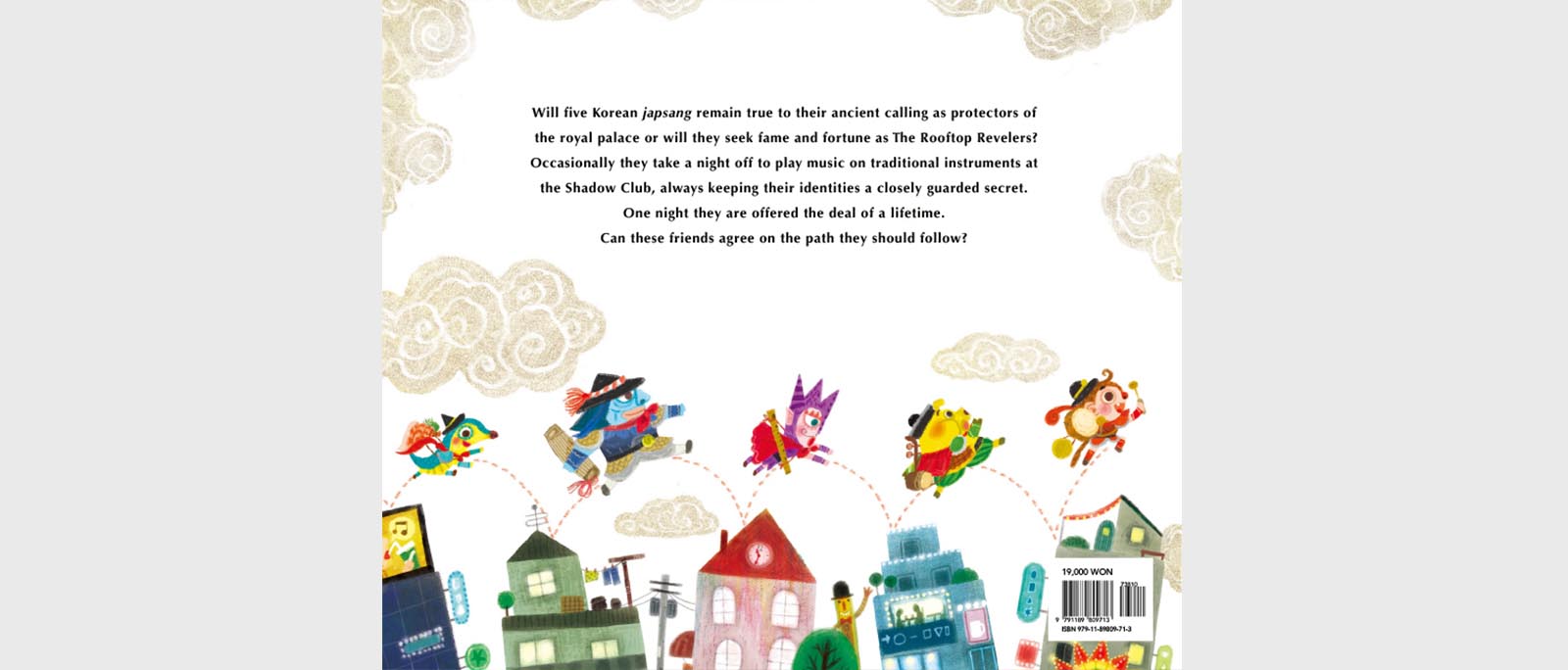 Will five Korean japsang remain true to their ancient calling as protectors of the royal palace, or will they give it all up for a life of fame and fortune? Occasionally the friends take a night off from their duties and make their way across the rooftops of Seoul to the Shadow Club, where as the Rooftop Revelers they wow the crowd with their unique brand of music, always keeping their true identities a closely guarded secret. Then one night they are offered a very modern deal of a lifetime. How will they ever decide? And can they all agree?