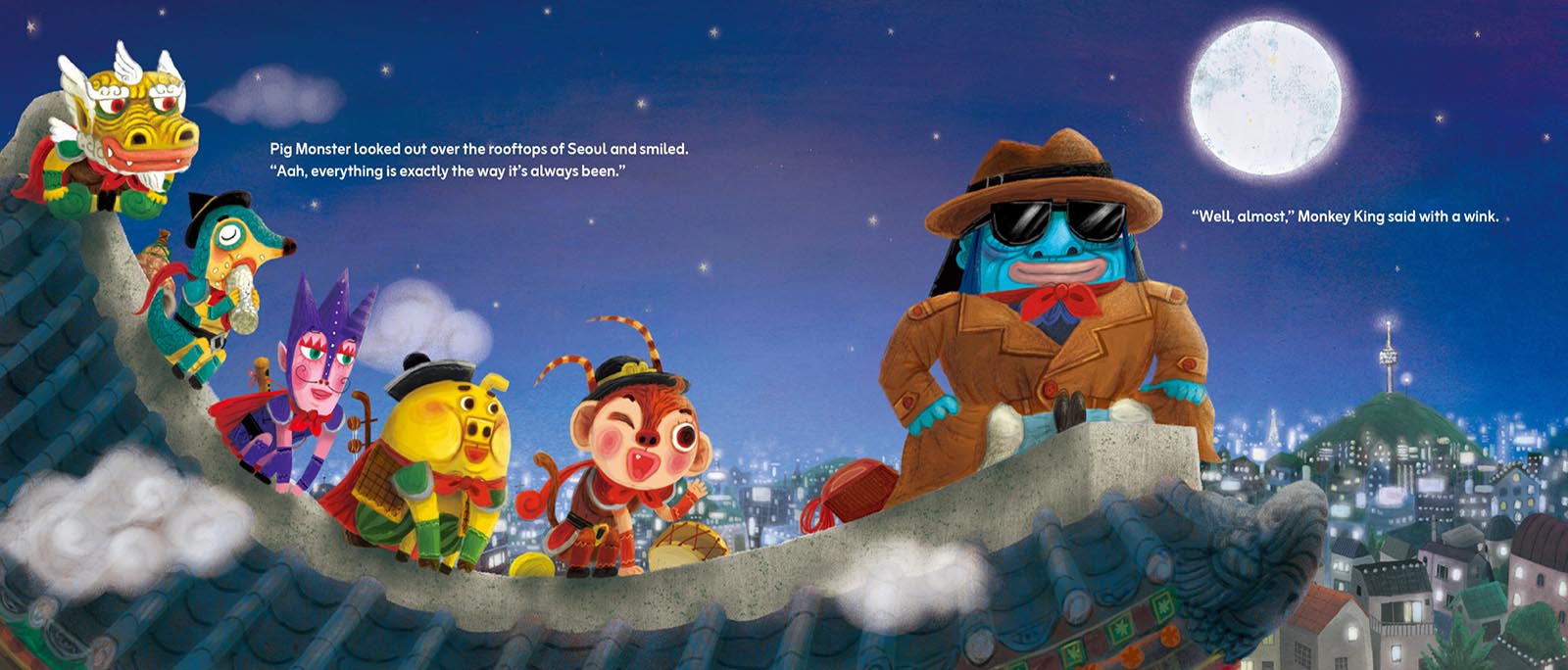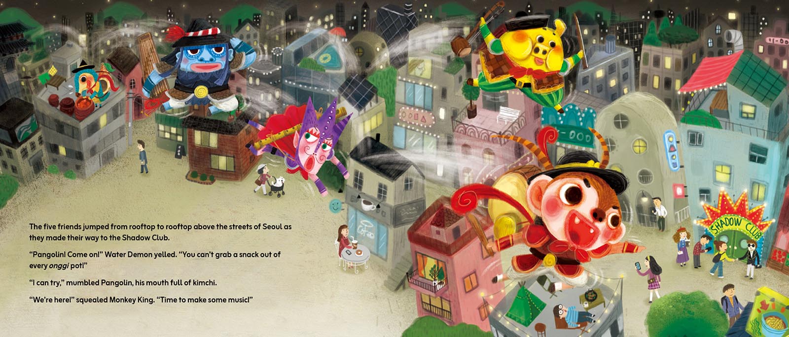 From the authors of "I Bite the Bad Guys: A Tale of the Korean Tiger" comes this hilarious tale of fun, friendship, adventure, and responsibility. Wildly colorful illustrations chock full of detail by Korean artist Sangin Lee give readers a lot to discover as they follow the japsang through the streets of Seoul. But the excitement really starts when The Rooftop Revelers take the stage at the Shadow Club. Who knew traditional Korean instruments could sound like that!?